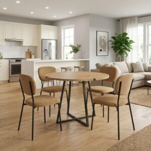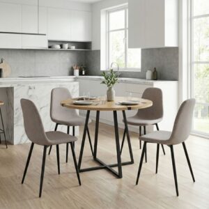 0279679 Σετ τραπεζαρία 5τμχ Rubes – Iris Megapap χρώμα φυσικό οξιάς – ανοιχτό μπεζ Ø100×78εκ. Ύφασμα/Μοριοσανίδα με επένδυση μελαμίνης, 1 Τεμάχιο