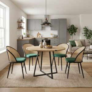 0279686 Σετ τραπεζαρία 5τμχ Rubes – Jacob Megapap χρώμα φυσικό οξιάς – κυπαρισσί Ø100×78εκ. Wicker/Βελούδο/Μοριοσανίδα με επένδυση μελαμίνης, 1 Τεμάχιο