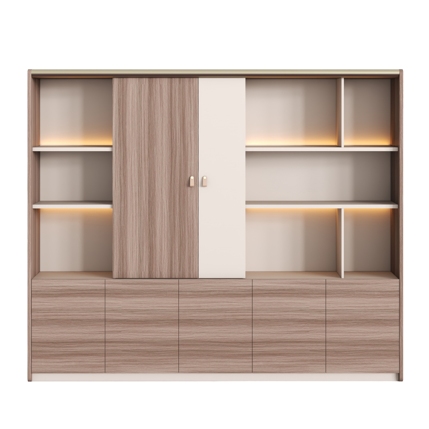 Διαθέτει ενσωματωμένο φωτισμό LED, ο οποίος αναδεικνύει τόσο τα ανοιχτά ράφια όσο και το συνολικό design, δημιουργώντας ένα premium αποτέλεσμα. Το κάτω μέρος αποτελείται εξολοκλήρου από ντουλάπια χωρίς ράφια, ιδανικά για αποθήκευση αρχείων και αντικειμένων που δεν χρειάζεται να είναι ορατά. Στο επάνω κεντρικό τμήμα υπάρχουν ντουλάπια με ράφια, ενώ οι ανοιχτοί αποθηκευτικοί χώροι διαθέτουν έτοιμη εγκατάσταση LED φωτισμού για άμεση χρήση.
