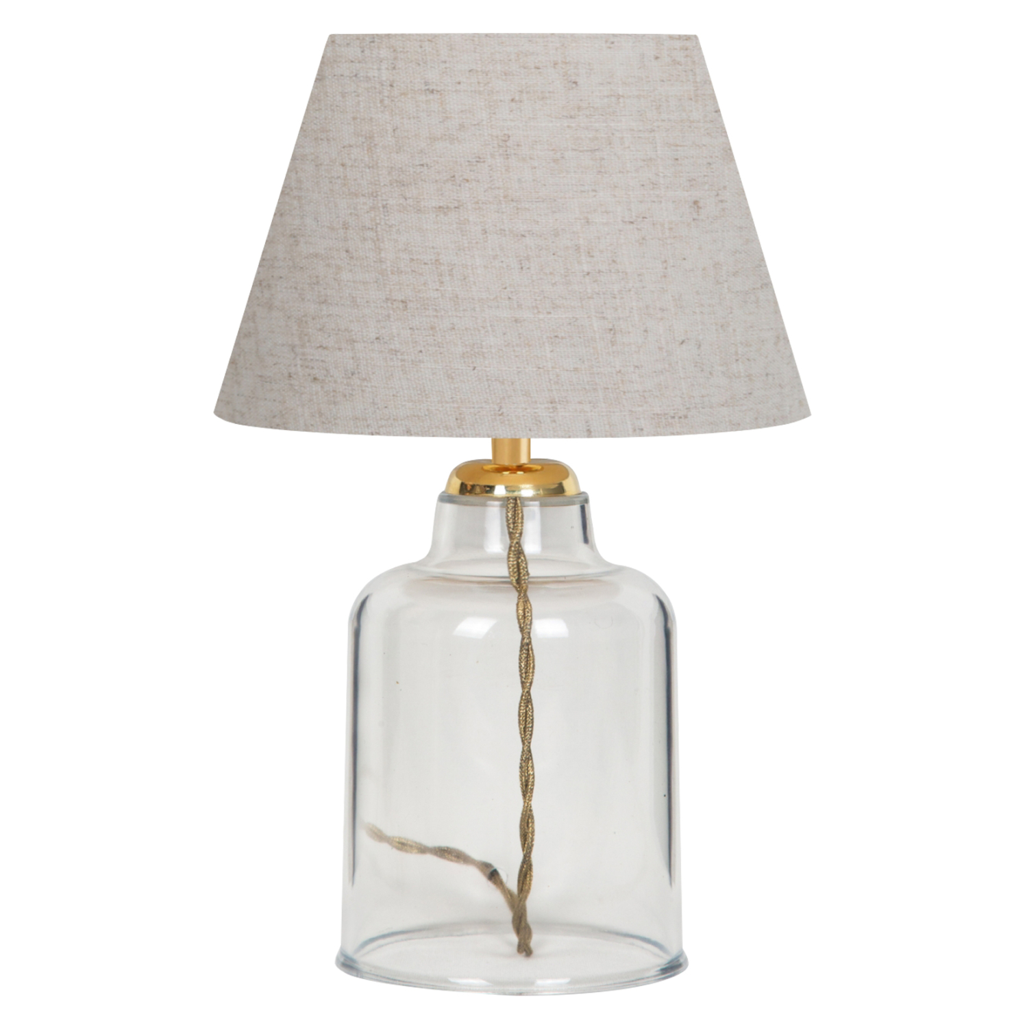 Φωτίστε τον χώρο που επιθυμείτε με το ευέλικτο επιτραπέζιο φωτιστικό με διαφανή πλαστικό κορμό. Ένας ειδυλλιακός συνδυασμός casual γοητείας και στιλβωμένου σχεδιασμού προσδίδει μια διαχρονικότητα που δεν θα γεράσει. Ο διαφανής κορμός κρατά αυτό το επιτραπέζιο φωτιστικό ελαφρύ και ευάερο. Η βάση και το «καπέλο» σε σχήμα ανοιχτής καμπάνας σε χρώμα εκρού συνδυάζονται για να δώσουν σε αυτή τη λάμπα την τέλεια υφή και χαρακτήρα αγροικίας. Η χρυσή κολώνα που αρχίζει να φαίνεται στην κορυφή του κορμού με το χρυσής απόχρωσης καλώδιο, δημιουργούν έναν όμορφο συνδυασμό, ενώνοντας ολόκληρη την εμφάνιση και προσθέτοντας στην απλή κομψότητα της λάμπας.
