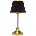 Επιτραπέζιο διακοσμητικό φωτιστικό με μονή κολώνα. Η βάση του φωτιστικού έχει καμπανοειδές σχήμα σε χρυσό γυαλιστερό χρώμα ενώ η κολώνα είναι επίσης σε χρυσό χρώμα και βρίσκεται μέσα σε πλαστικό διαφανή σωλήνα. Το «καπέλο» έχει τραπεζοειδές κυκλικό σχήμα σε εκρού χρώμα και έχει χρυσούς δακτυλίους στις άκρες του. Το φως διαχέεται στον χώρο ευχάριστα και η αντανάκλασή του πάνω στην διάφανη κολωνίτσα του φωτιστικού αλλά και στην γυαλιστερή επιφάνεια της βάσης, παιχνιδίζει ευχάριστα στο μάτι. Αυτού του είδους τα φωτιστικά δεν προορίζονται για φωτιστικά διαβάσματος και αυτό πρέπει πάντα να λαμβάνεται υπόψη κατά την επιλογή τους. Είναι καθαρά διακοσμητικά και το ταίριασμά τους με τον περιβάλλοντα χώρο θα πρέπει να είναι αρμονικό. Αυτό το φωτιστικό είναι κομψό και βολικό σε διαστάσεις παρέχοντας αμέτρητες δυνατότητες «δεσίματος» με την υπόλοιπη διακόσμησή σας. Είναι ένα μικρό έργο τέχνης.