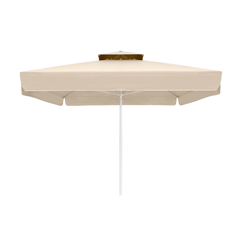 Τετράγωνη ομπρέλα αλουμινίου με τηλεσκοπικό μηχανισμό και διπλό αεραγωγό που επιτρέπει την κυκλοφορία του αέρα μειώνοντας ταυτόχρονα την πίεση του. Ιδανική επιλογή για επαγγελματική χρήση όπως beach bars, πισίνες και χώρους εστίασης.Τεχνικά χαρακτηριστικά:
