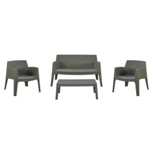Καναπές γωνία με μεγάλα μαξιλάρια από ύφασμα σε γκρι χρώμα και σκελετό αλουμινίου σε λευκό χρώμα σε συνδυασμό με λεπτομέρειες από υλικό polywood σε απόχρωση του ξύλου.