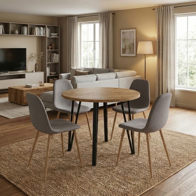 0283456 Σετ τραπεζαρία 5τμχ Xana – Iris Megapap χρώμα sepet oak – ανοιχτό μπεζ/φυσικό πόδι Ø90×77,7εκ. Ύφασμα/Μοριοσανίδα με επένδυση μελαμίνης, 1 Τεμάχιο