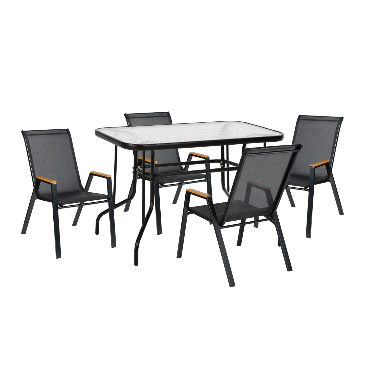 Αυτό το Σετ τραπεζαρίας εξωτερικού χώρου διαθέτει τραπέζι με ΜΑΥΡΟ μεταλλικό σκελετό και γυάλινη θολή ΕΝΙΣΧΥΜΕΝΗ επιφάνεια, και 4 μεταλλικές πολυθρόνες με κάθισμα και πλάτη από textilene ύφασμα σε ΜΑΥΡΟ ενώ έχει και λεπτομέρεια με ξύλο στα μπράτσα.