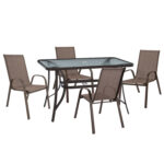 Αυτό το Σετ τραπεζαρίας εξωτερικού χώρου διαθέτει τραπέζι με ΣΑΜΠΑΝΙ μεταλλικό σκελετό και γυάλινη θολή ΕΝΙΣΧΥΜΕΝΗ επιφάνεια, και 4 μεταλλικές πολυθρόνες με κάθισμα και πλάτη από textilene ύφασμα σε ΣΑΜΠΑΝΙ ενώ έχει και λεπτομέρεια με ξύλο στα μπράτσα.