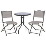 Σετ εξωτερικού χώρου με στρογγυλό τραπέζι με ΚΑΦΕ μεταλλικό σκελετό και γυάλινη θολή ΕΝΙΣΧΥΜΕΝΗ επιφάνεια και 2 μεταλλικές πτυσσόμενες καρέκλες με textilene, σε ΚΑΦΕ χρώμα.